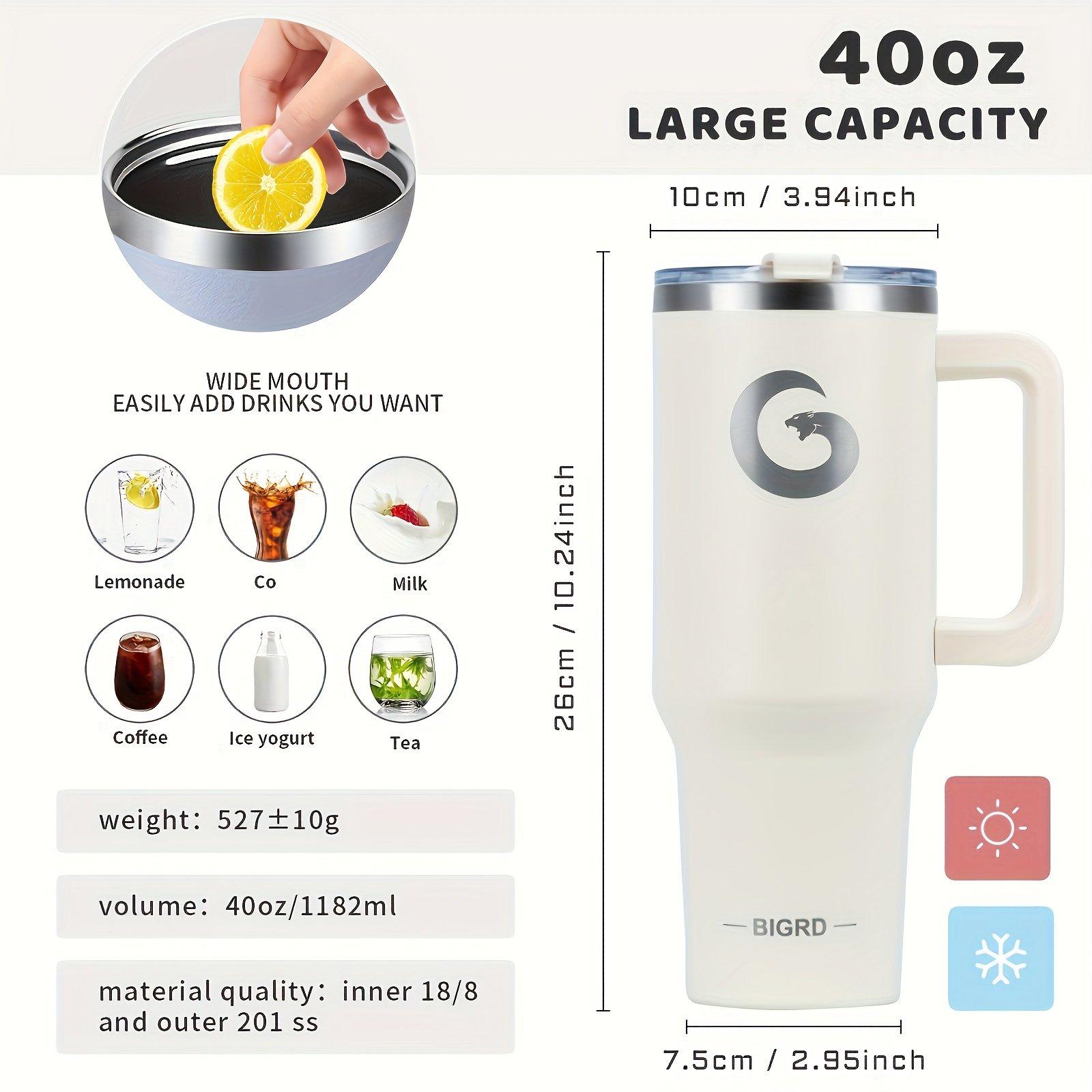 1 gobelet BIGRD de 40 oz avec poignée et paille, tasse de voyage entièrement étanche, en acier inoxydable avec isolation sous vide à double paroi pour le café, livré avec des accessoires comprenant un couvercle 2-en-1, une paille en acier, un nettoyant et un sac de transport