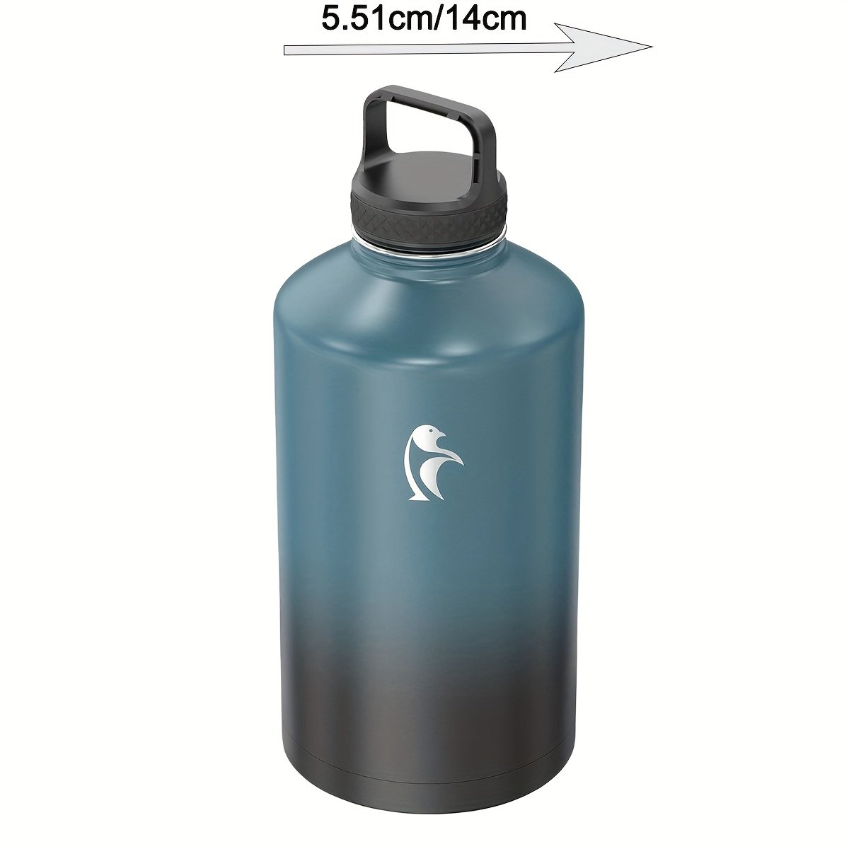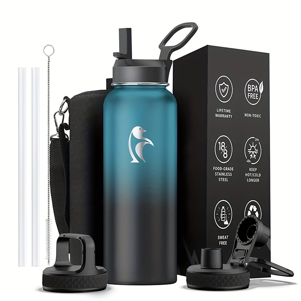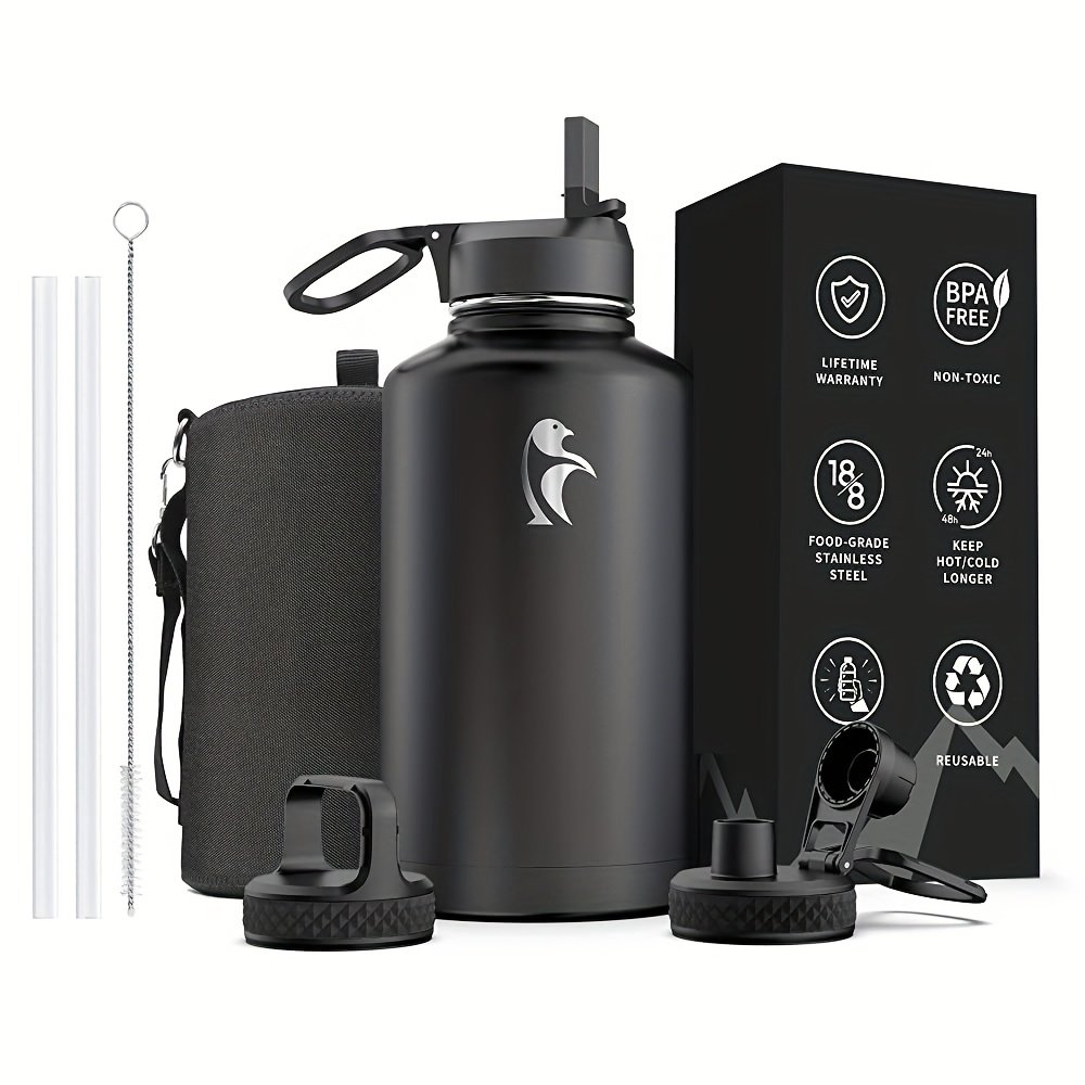 1pc Bouteille d’eau d’un gallon isolée avec paille et 3 couvercles, 128 oz grande carafe d’eau en acier inoxydable à double paroi sous vide à large ouverture pour le sport, la salle de sport ou le bureau, sans BPA, garde le froid pendant 48 heures et le chaud pendant 24 heures, bleu noir/noir