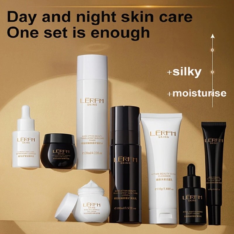 8pcs Ensemble de soins de luxe en collagène lumineux beige – Nourrit en profondeur et lisse le beige lumineux – Contient le Pro-Xylane, la vitamine C – Contient un nettoyant, un toner, un sérum, une crème pour les yeux, une crème de jour, une crème de nuit – Boîte cadeau haut de gamme, convient comme cadeau de vacances, spray ignifuge pour hommes, lotion pour femmes, lotion corporelle, crème pour hommes