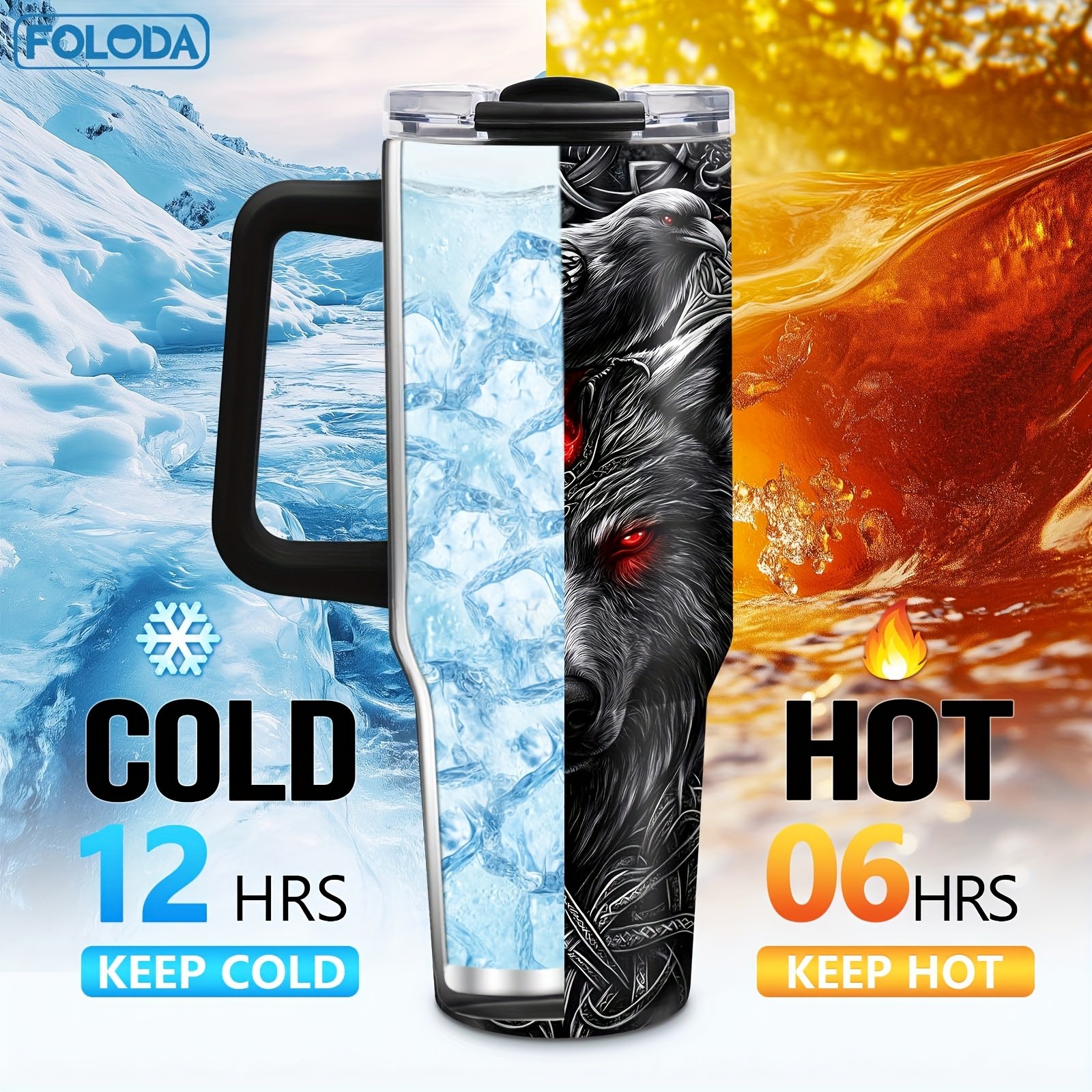 Gobelet Viking Wolf Foloda de 40 oz avec poignée et paille – Tasse de voyage isotherme en acier inoxydable, étanche, cadeau parfait pour les hommes, fête des pères, anniversaire, Noël, tasse de voiture pour l’extérieur, tasse de voyage pour café