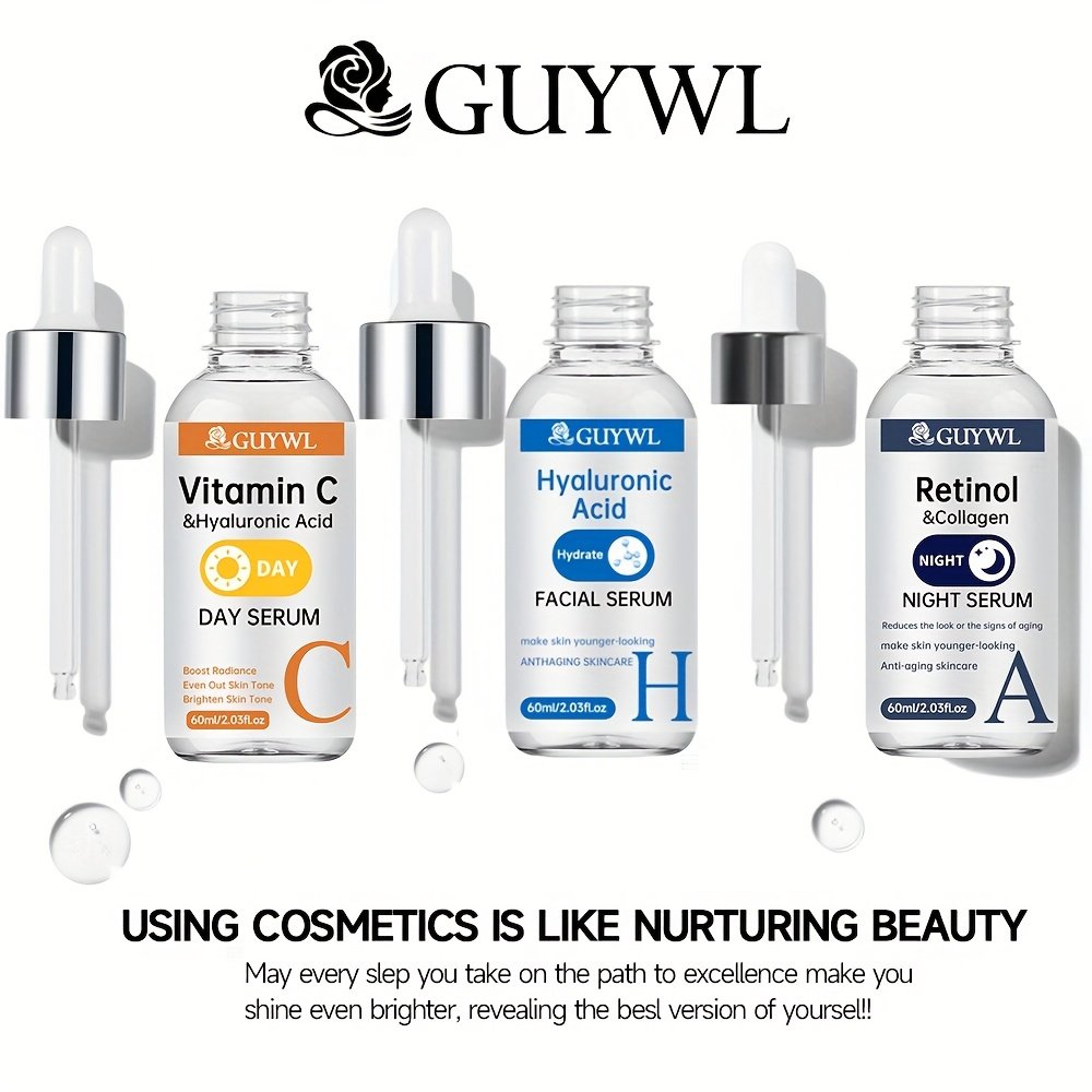Le coffret 3 pièces de Guywl comprend des sérum de vitamine C, de rétinol et d’acide hyaluronique jour et nuit, associés au collagène, à l’acide tranexamique et à la niacinamide. Il éclaire le teint, raffermit la peau, hydrate en profondeur et uniformise le teint.